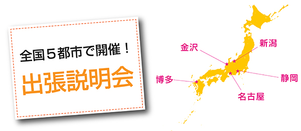 博多・名古屋・静岡・新潟・金沢の5都市にて、学校説明会を開催します!遠方にお住まいで、なかなか学校までお越しになれない方は、この機会にぜひいらしてください。