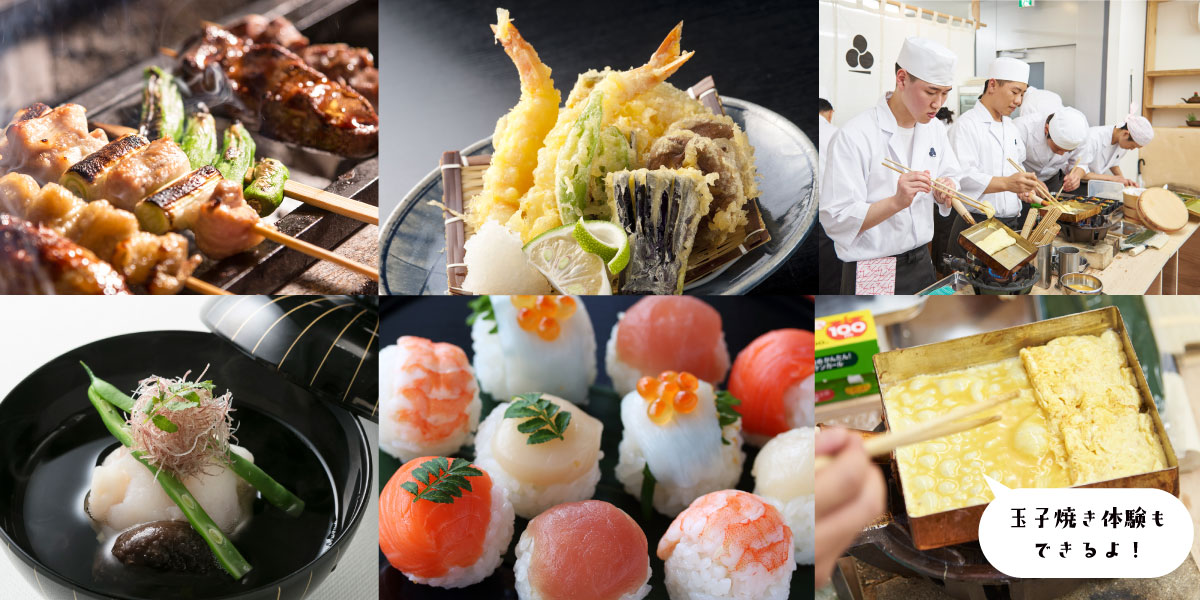 日本国内の一流店や海外レストランで経験を積んだ講師陣が作った本格和食や、在校生が考えたオリジナルメニューなどいろいろな和食をたくさん召し上がっていただけます。ご家族やお友だちを誘ってぜひご参加ください!(※ご同伴者1名様まで)さらに「玉子焼き」作りも体験していただけます。