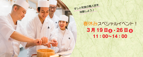 | 3月19日(土)『すし職人体験』 献立:鉄火巻き・まぐろの握りずし | 3月26日(土)『和食料理人体験』 献立:鯛茶づけ |